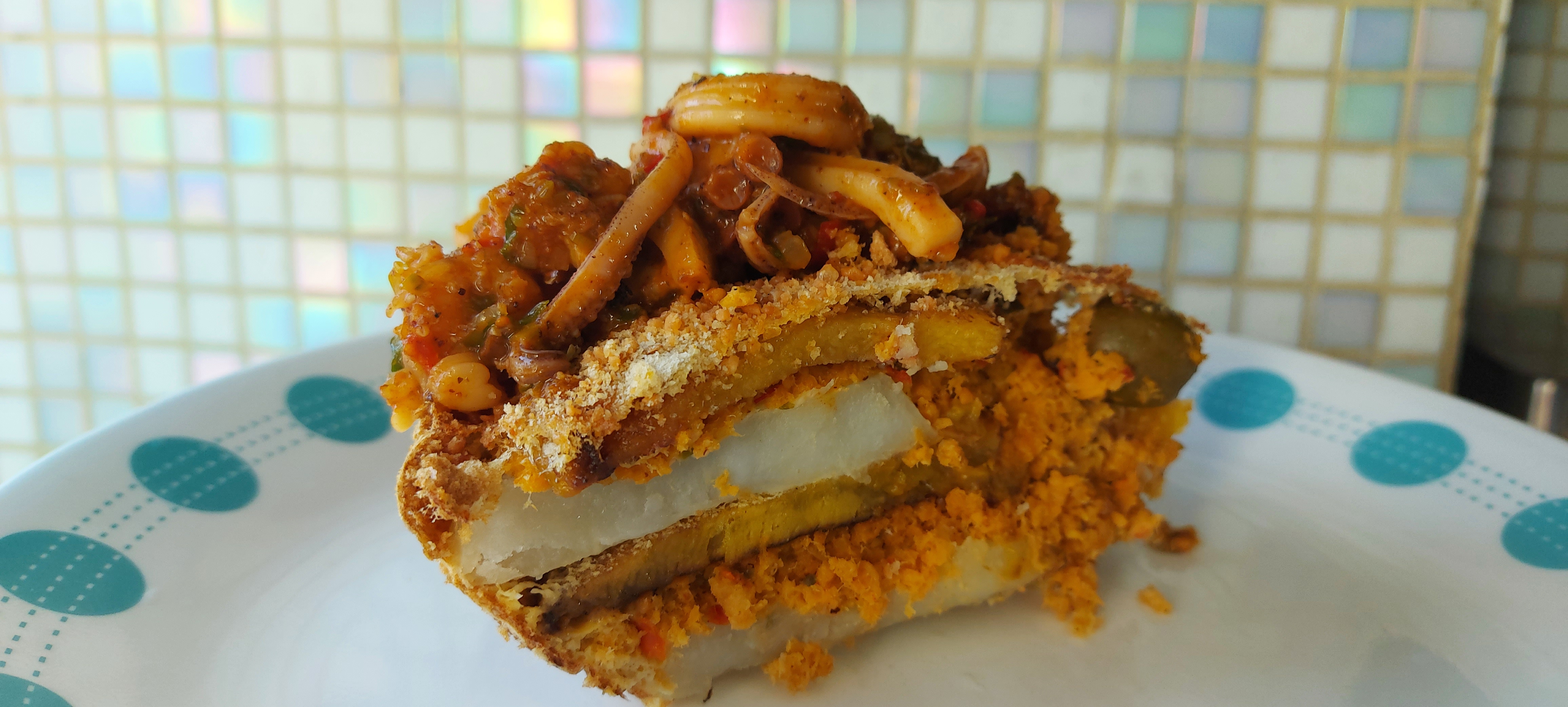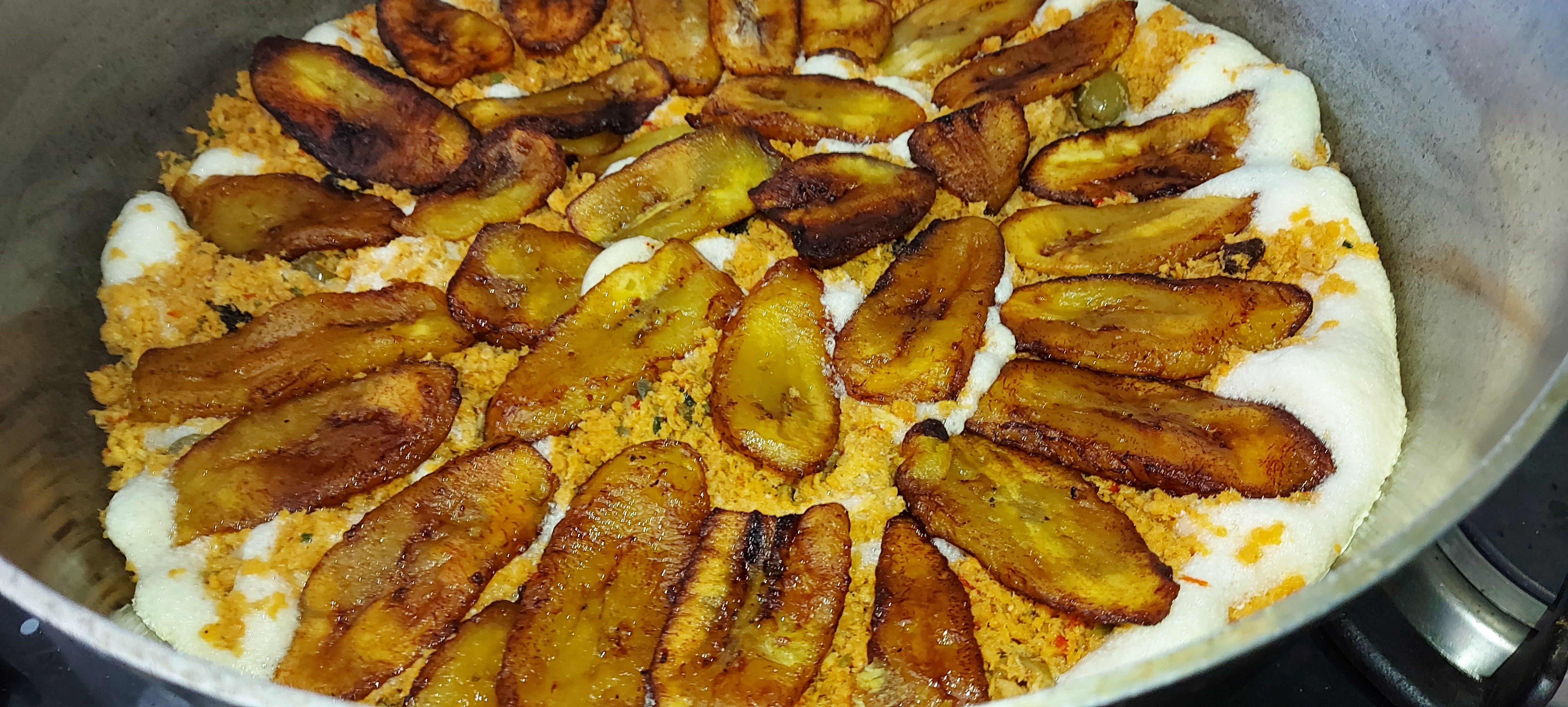 Este es un plato que suele estar en las mesas orientales para los días de Semana Santa, es una especie de tortilla o pastel que combina por capas plátano frito maduro, papas, pescado. Algunos varían los ingredientes pero en líneas generales es la combinación de lo salado y dulce del plátano.