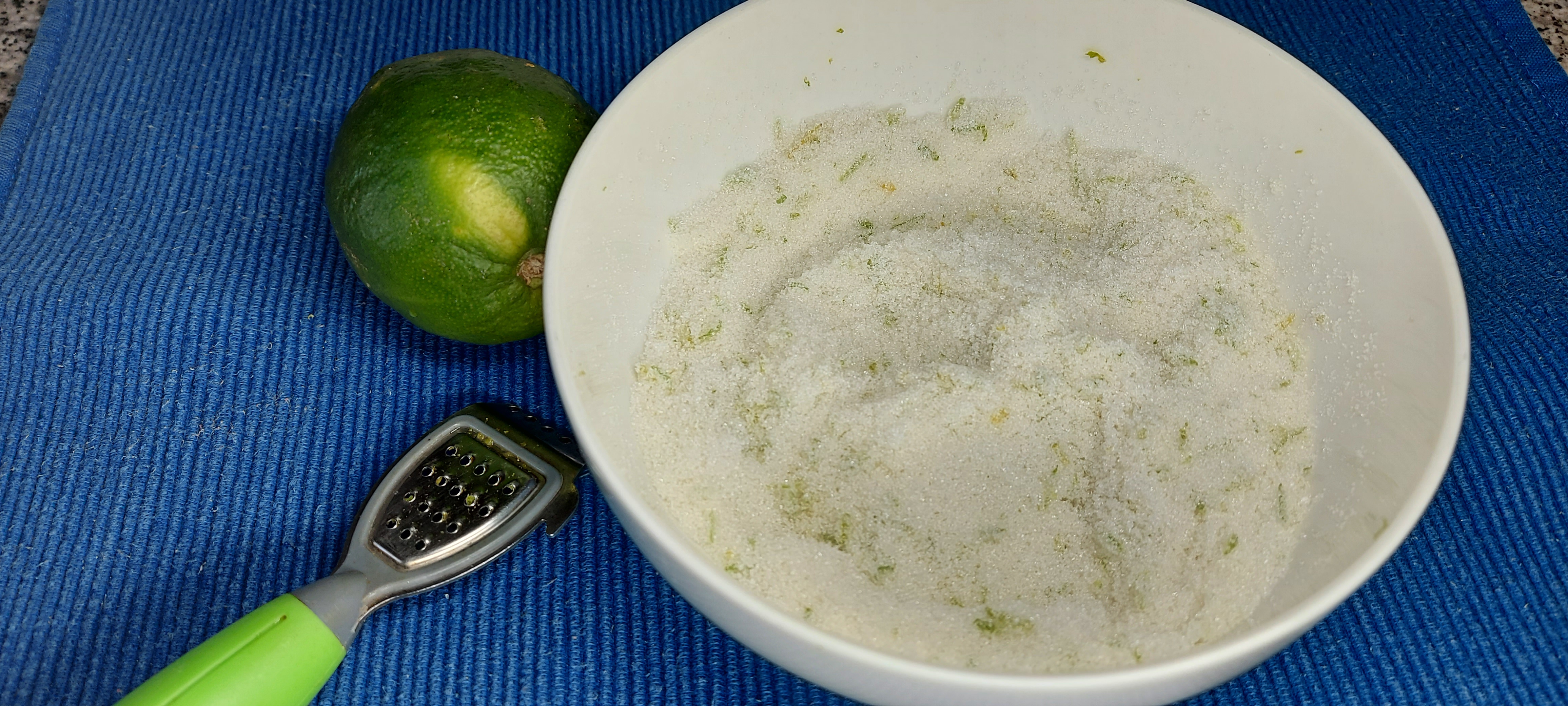 Unir los 100 gramos de azúcar con la ralladura de limón. Si lo puedes pasar por mortero mejor, para que el aceite de la concha del limón se desprenda.