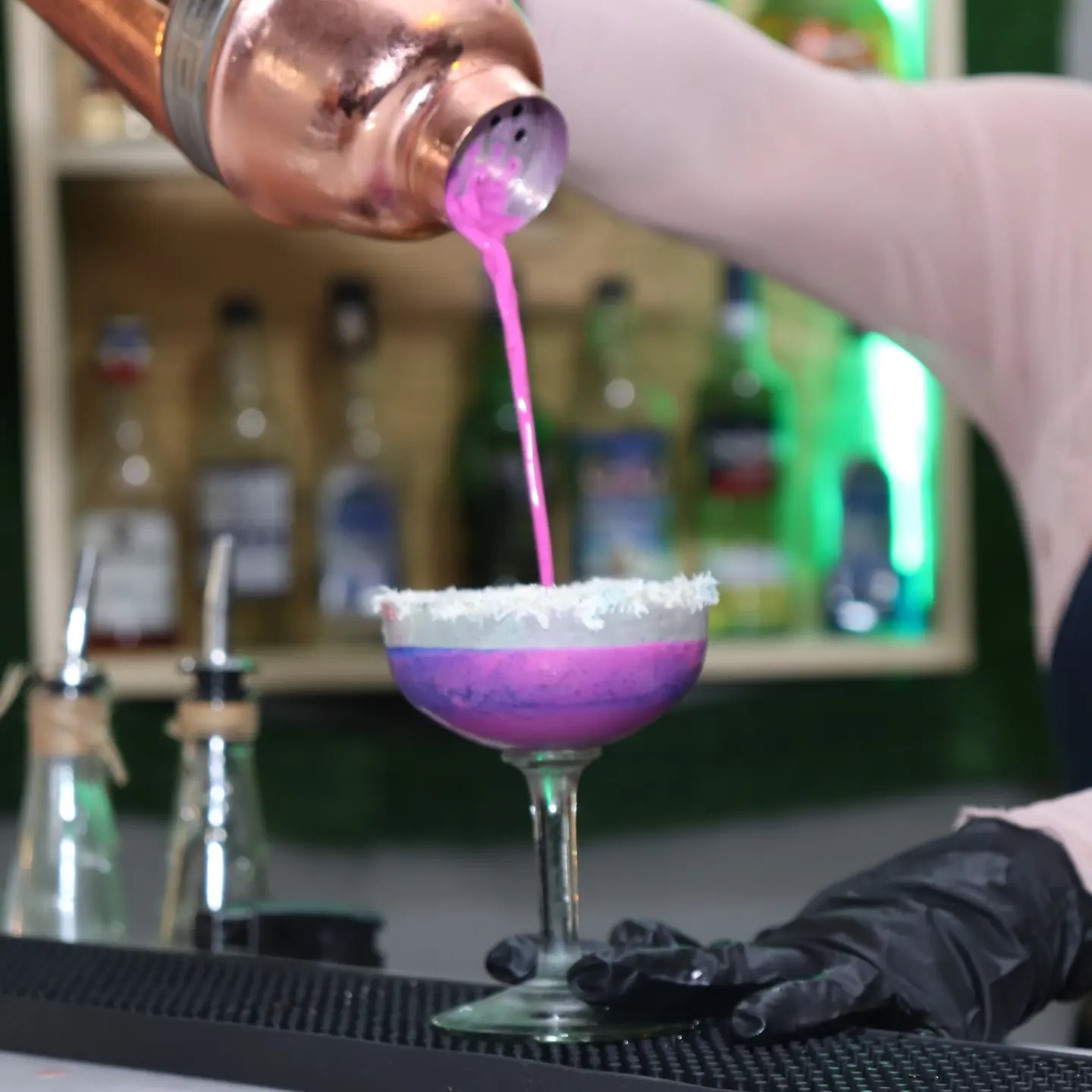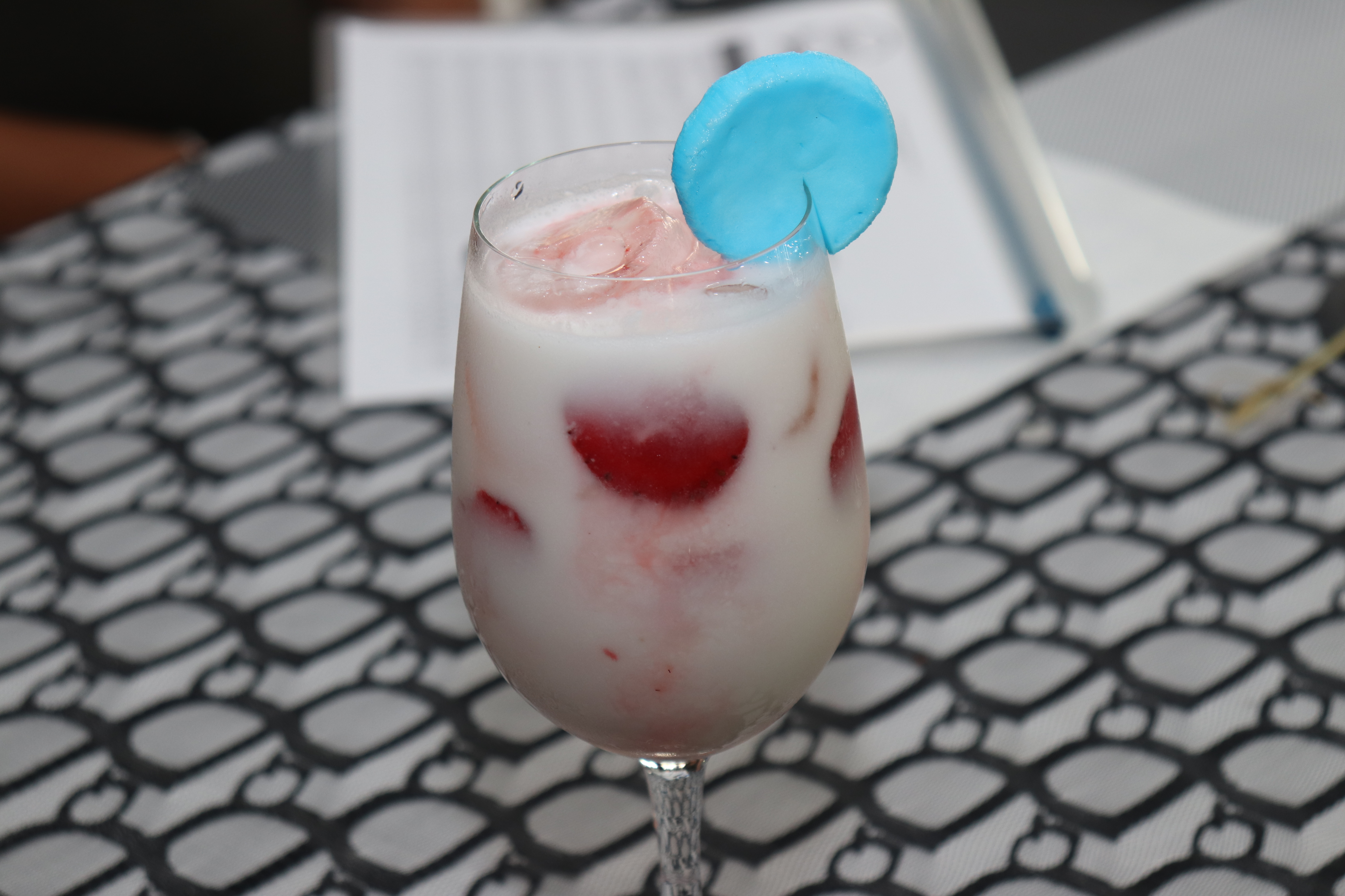 Haciendo honor a los atardeceres de #Lecheria Yoselin Lugo presentó un «Sunset Feels», en el que combinó pitahaya, leche de coco, leche condensada, licor macerado de Mora, tequila y Curacao Azul, obteniendo un cremoso cóctel de tonos rosados y morados.