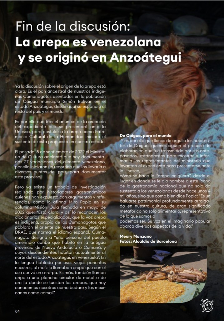 Pero ya existe un trabajo de investigación realizado por historiadores gastronómicos quienes han expuesto con argumentos y referencias, como lo afirma Miro Popic en su columna Misión Gula fechada en mayo de 2022 que: “Está claro, y así lo reconocen los diccionarios especializados, que la voz arepa es indígena, propia de los Cumanagotos que poblaron el oriente de nuestro país. Según el DRAE, que norma el idioma español, Cumanagoto designa a “una persona del pueblo amerindio caribe que habitó en la antigua provincia de Nueva Andalucía o Cumaná, y cuyos descendientes habitan actualmente al norte del estado Anzoátegui, en Venezuela”.