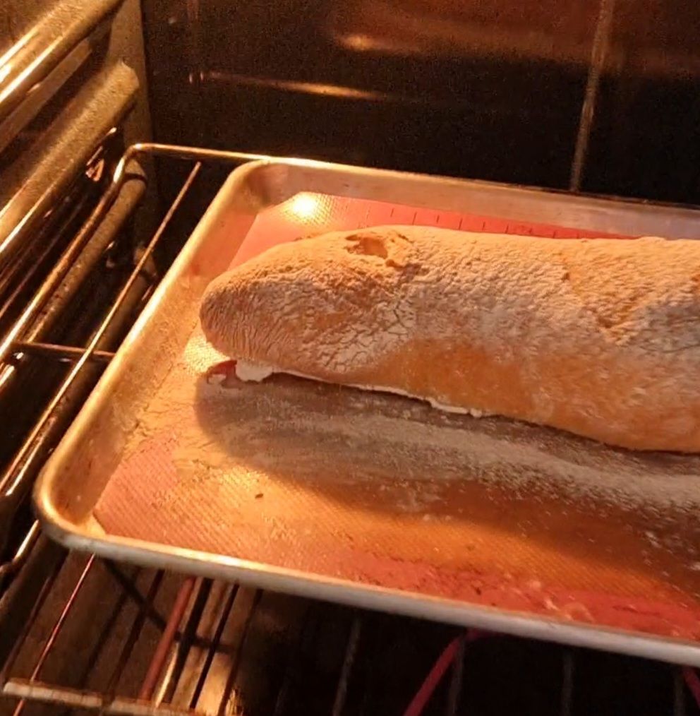 Realiza unos cortes en la superficie con un cuchillo afilado. Rocía con agua y hornea durante 15 minutos a 220°C. Luego, baja la temperatura a 180°C y hornea durante otros 30 minutos, o hasta que el pan esté dorado y suene hueco al golpear la base.