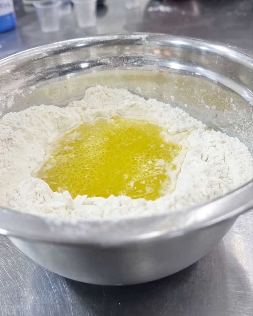 Puedes usar un envase o trabajar en un mesón de una vez haciendo una corona. A la harina le colocas la sal, levadura, abres un hueco en el centro y agregas el aceite y agua, comienzas a integrar y luego a amasar. Unos 15 minutos de amasado podrían ser suficientes. Cuando notes que la masa está lisa, como piel de bebé, la llevas a leudar hasta que duplique su tamaño, eso puede tardar entre 45 minutos y una hora, dependiendo la temperatura ambiente del lugar que la tengas, mientras más cálido, más rápido se activa la levadura.